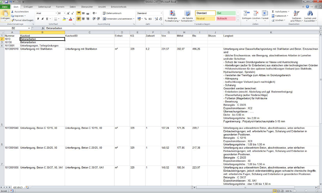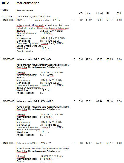 Beispielseite für die Datenausgabe im Datenformat "RTF" für das Gewerk "1012 Mauerarbeiten" mit Ausgabe der Kurztexte, Langtexte, Kostengruppe, den "Von-mittel-bis"-Baupreisen u |