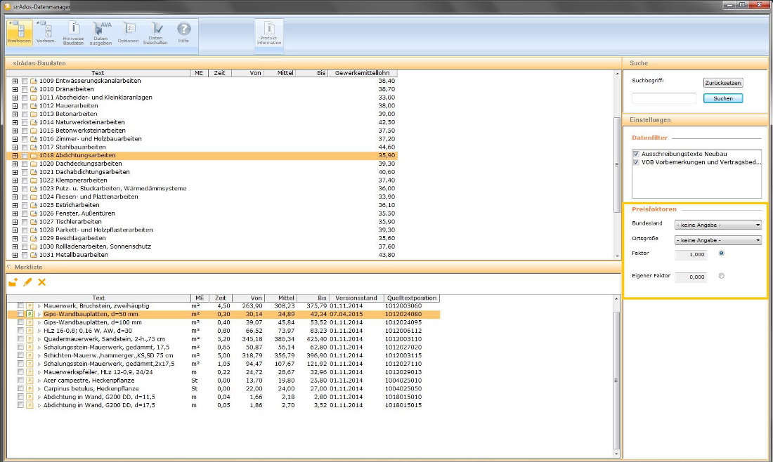 Der sirAdos-Datenmanager ist eine intuitiv bedienbare Software mit benutzerfreundlicher Bedienoberfläche für die Verwaltung der unterschiedlichen Baudatenpakete. Die sirAdos Ausschreibungstexte für die Bereiche Gebäudetechnik werden mit dieser modernen Bedienoberfläche ausgeliefert.