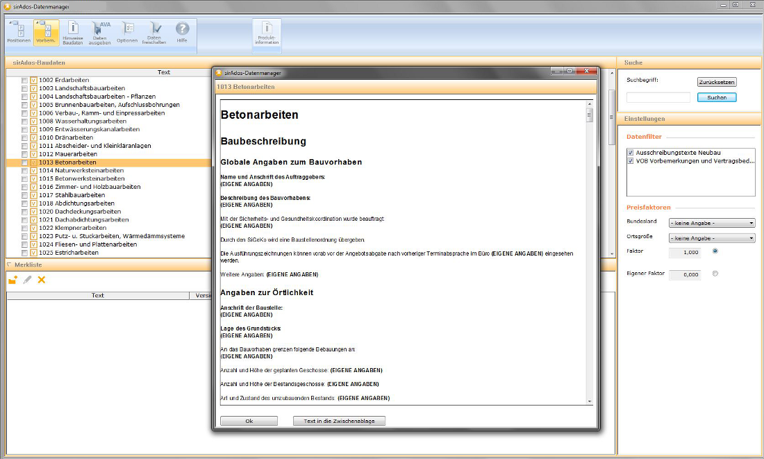 Positionen auswählen VOB-konforme Leistungsbeschreibungen